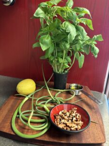 — 1 cup garlic scapes, which you can grow yourself or find at a farmer’s market cut into 1-2 inch lengths (I don’t use the blossom ends, but Jayne adores them.)